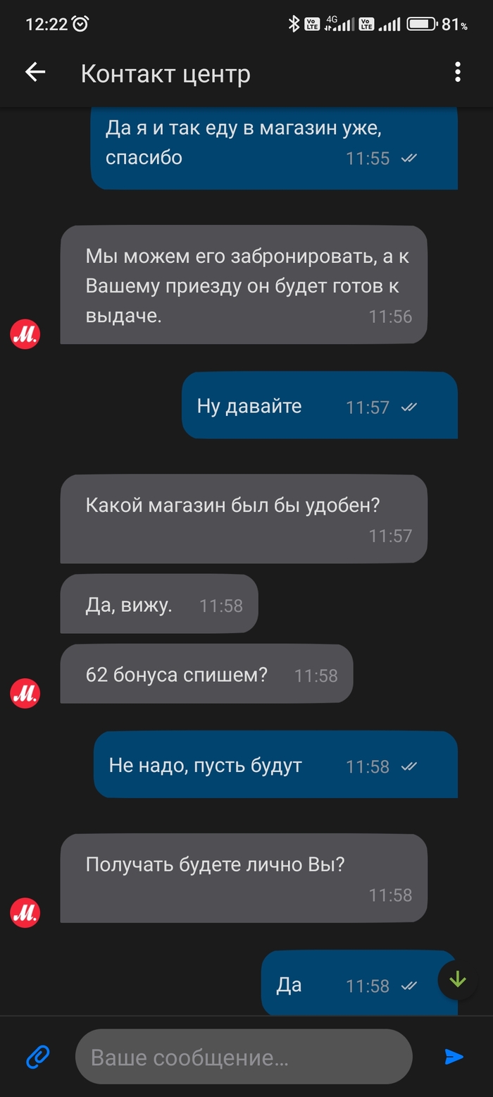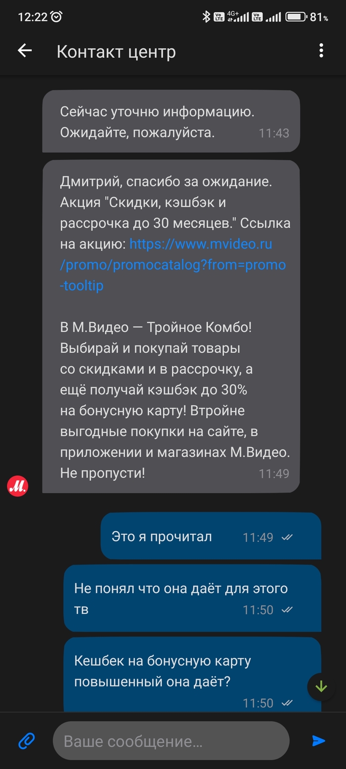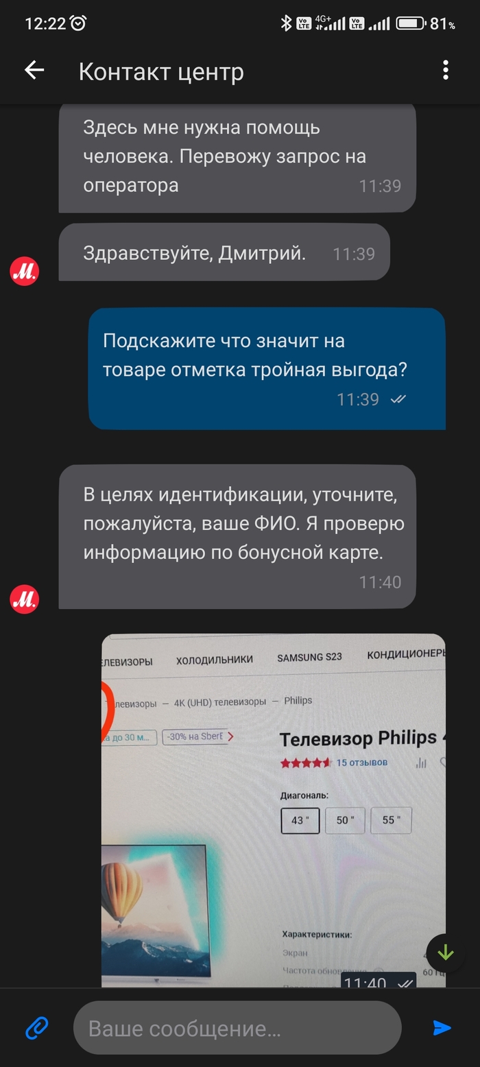 Дальше как вы понимаете, мне приходит информация в приложении о начислении стандартных бонусов, сколько у них их там, 3% что ли. Я звоню на горячую линию, они принимают мою жалобу и создают обращение № 23-05363091. Вот только что перезвонили по обращению и сказали, что они просмотрели наше общение с оператором и не видят неверной консультации, по их словам я спрашивал про акцию в целом, а не про конкретный телевизор...