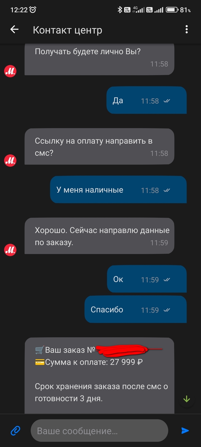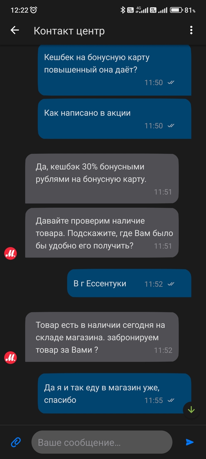 Поэтому решил написать в чат оператору. Спросил, что за акция, в которой учавствует данный ТВ, и будет ли по ней на этот ТВ повышенный кешбек. Меня заверили, что кешбек по акции - 30%, после чего я оформил заказ и поехал в магазин забрал его.