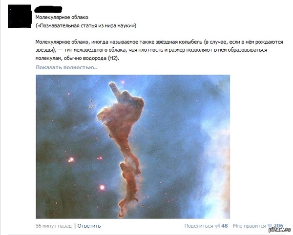 1 NencyLol 11 лет назад Молекулярное облако Мне кажется или молекулярное облако мне не радо? ВКонтакте Космос