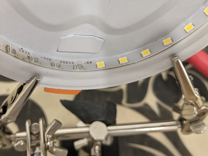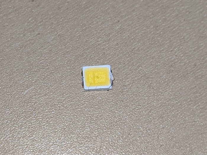 После того, как успешно справились с выпаиванием, смотрим восстанавливаемый светильник и находим виновника. Найти его, как правило, не составляет труда - на нём чётко видно чёрную точку (иногда точка размером с светодиод).