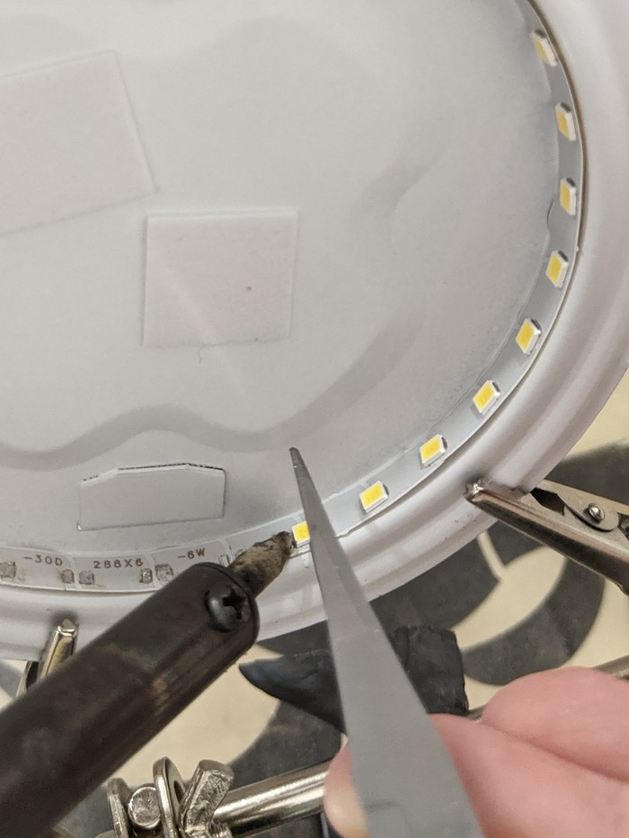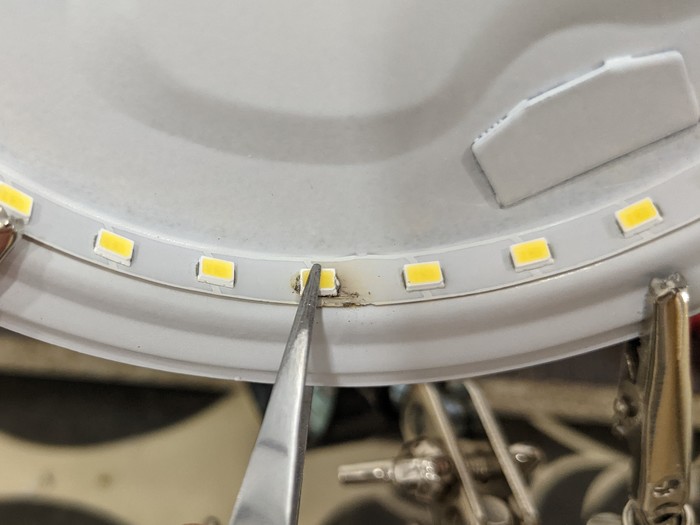 Устанавливаем рабочий светодиод на место, нужно положить его ровно на то же место где был виновник, иначе можно закоротить его контакты, работоспособность светильника при этом восстановится, но этот светодиод гореть не будет. Прижимаем его пинцетом и аккуратно греем с двух сторон.