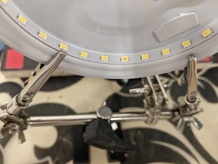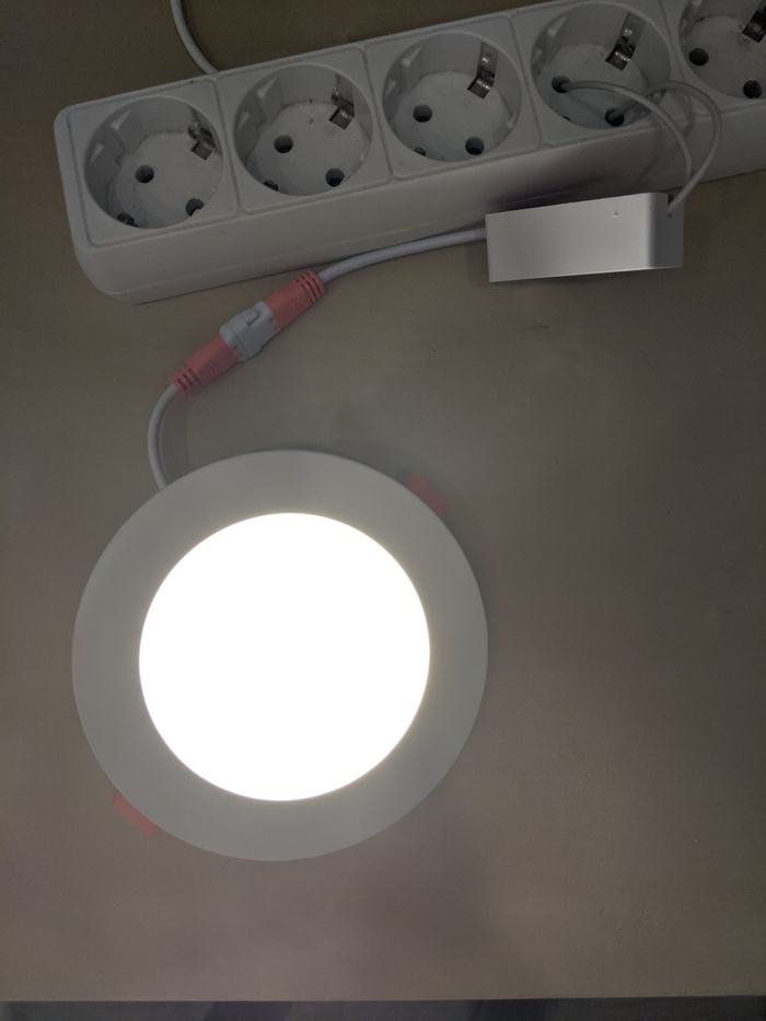 Вынимаем светильник из лап держателя и проверяем на работоспособность любым удобным способом. Я просто подключаю его к драйверу и вставляю концы в розетку (Не повторять!):