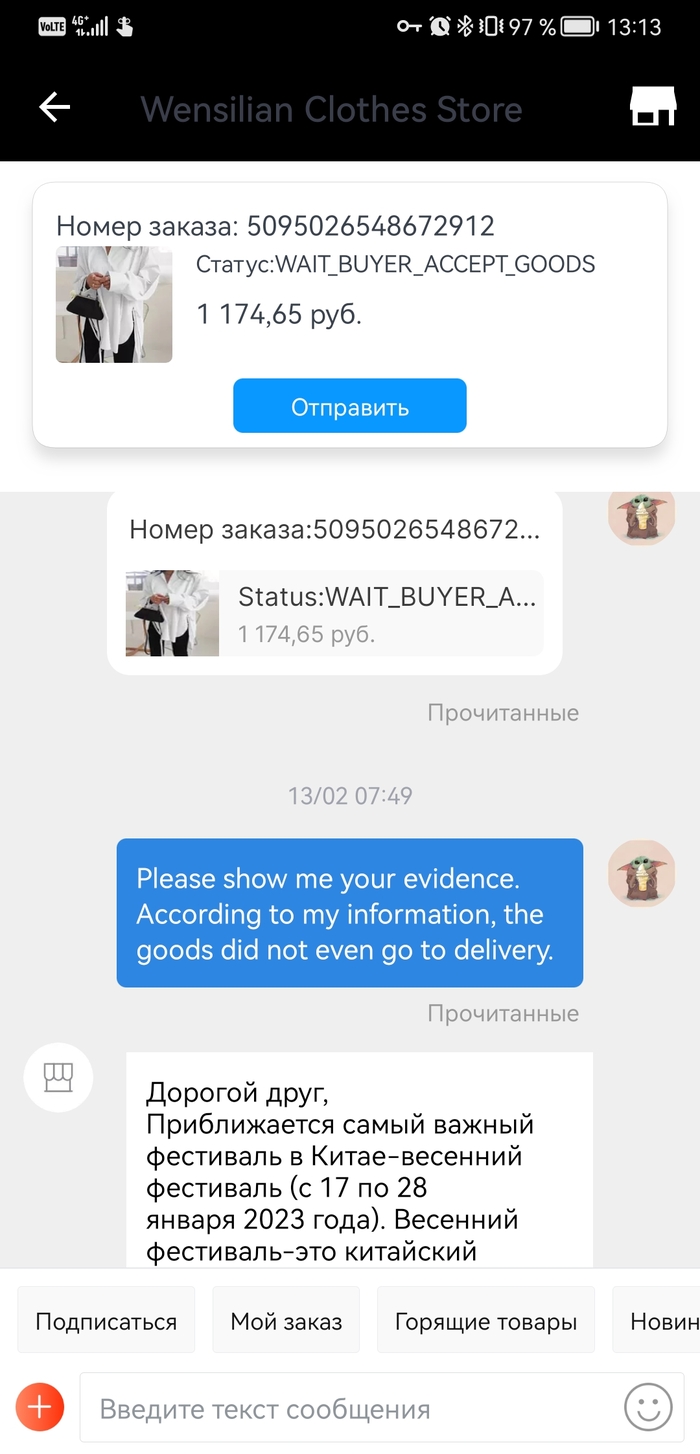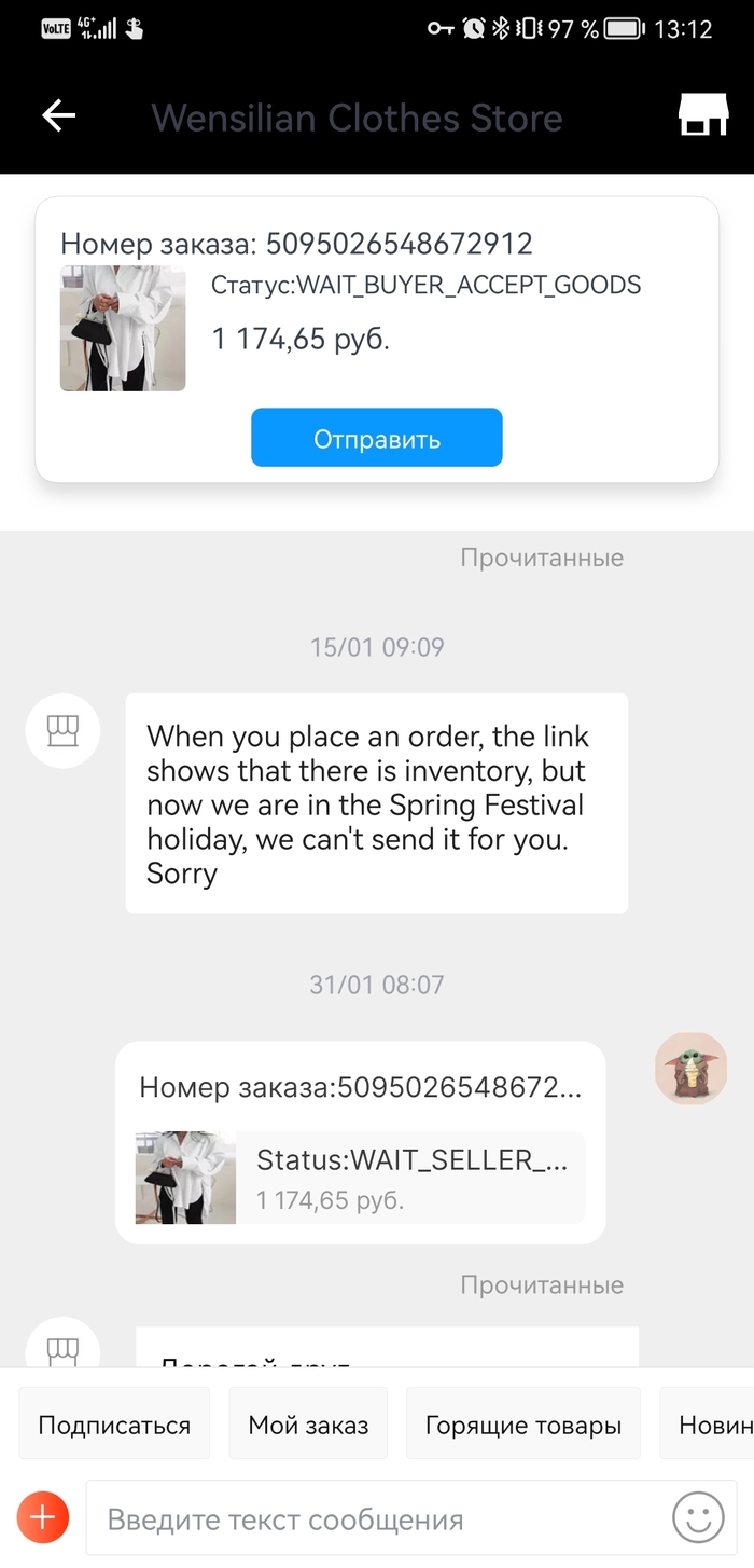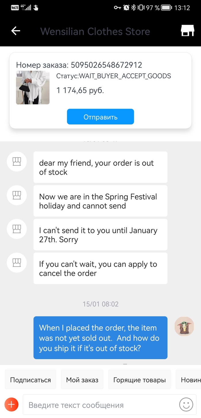 С этого года есть один заказ, заказала матушке рубашку , которая ей приглянулась, так вот эта редиска, с 6 января ничего не отправляет, кормит завтраками, делает вид что по пути на почту потерялось и доказательства не показывает. Я уже просто негодую. Как бы можно и спор открыть, но денег я все равно не увижу, да и дело принципа это.