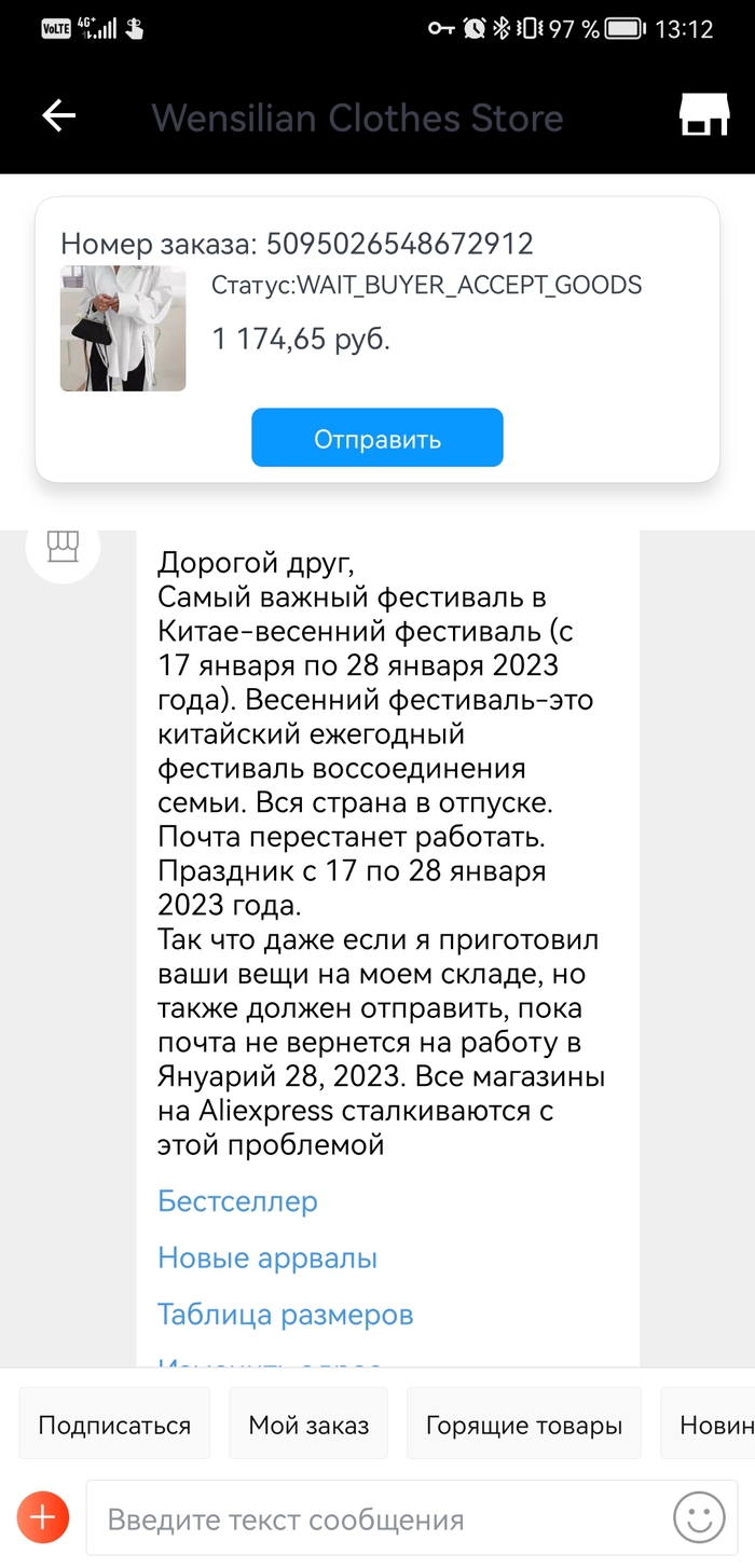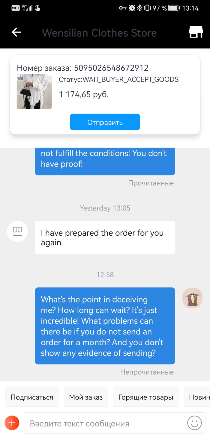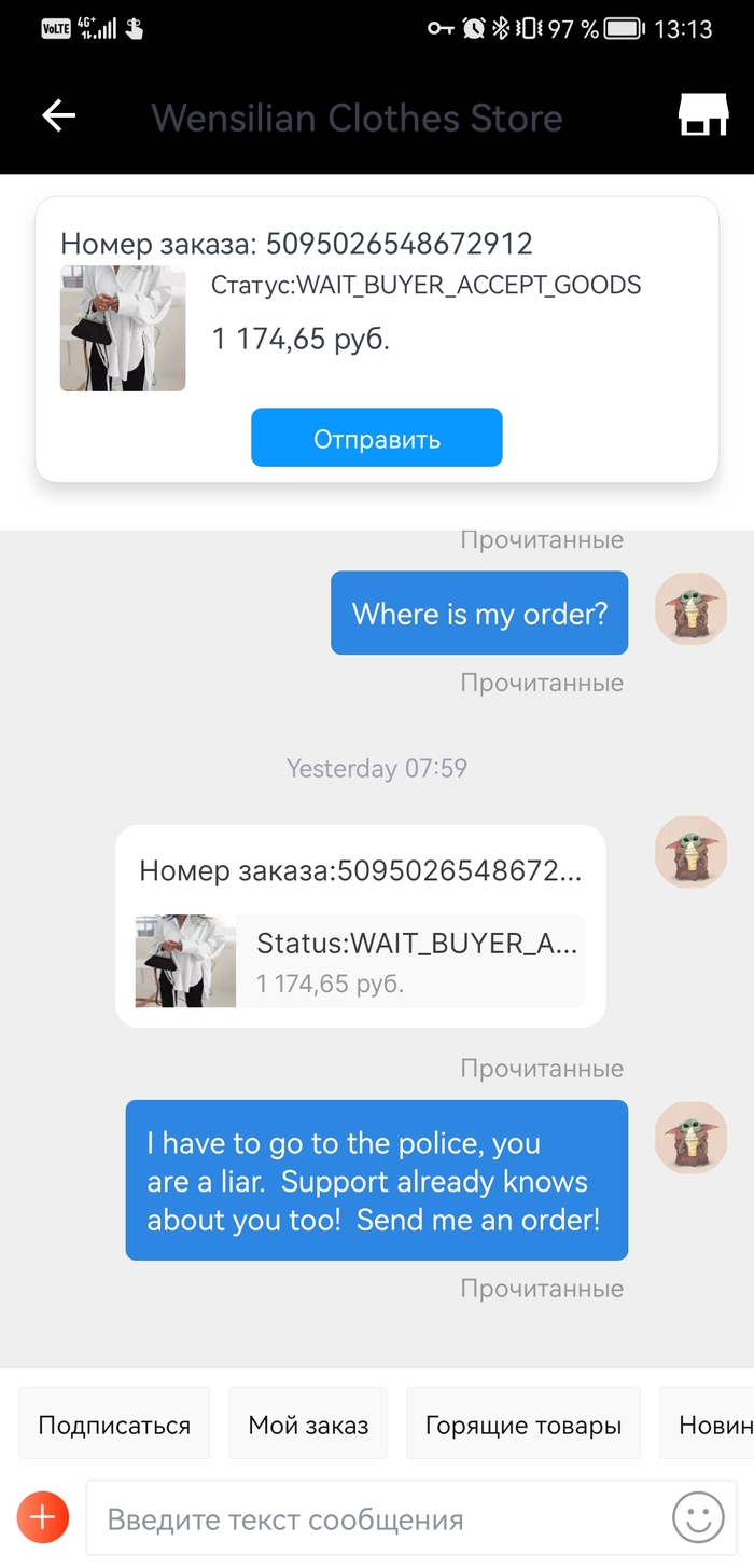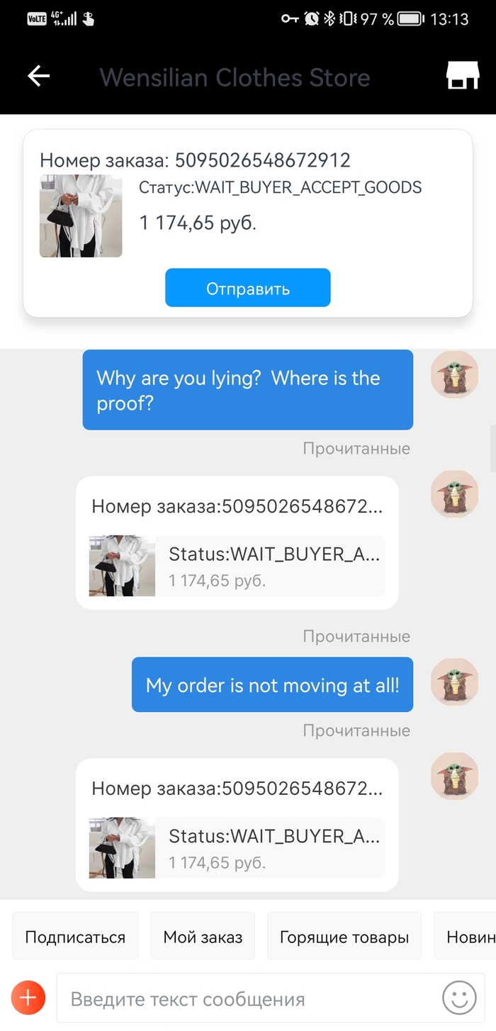 С этого года есть один заказ, заказала матушке рубашку , которая ей приглянулась, так вот эта редиска, с 6 января ничего не отправляет, кормит завтраками, делает вид что по пути на почту потерялось и доказательства не показывает. Я уже просто негодую. Как бы можно и спор открыть, но денег я все равно не увижу, да и дело принципа это.