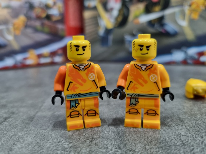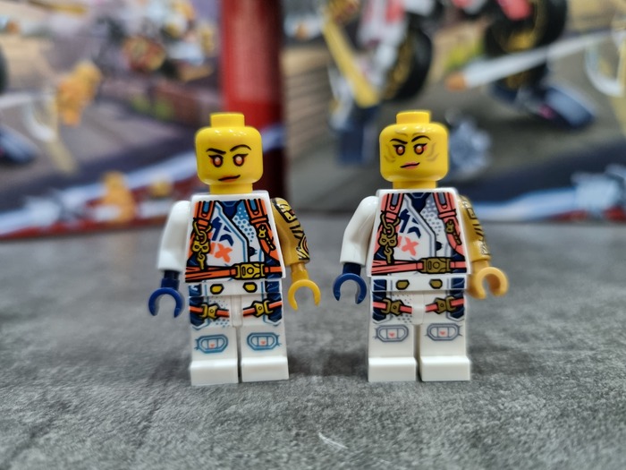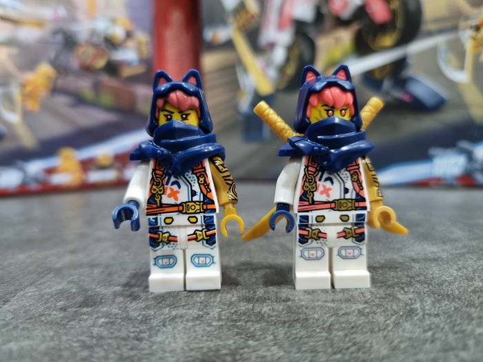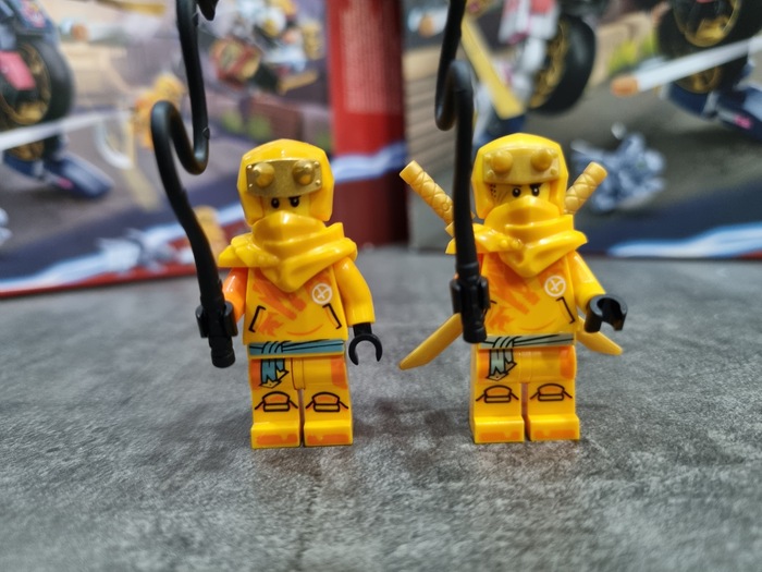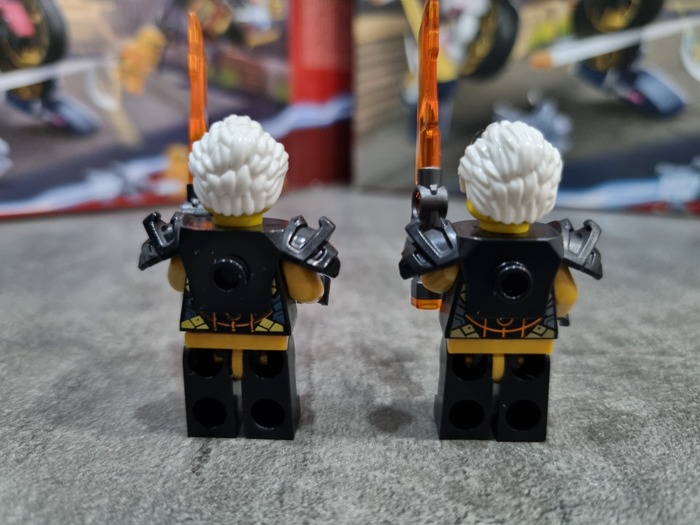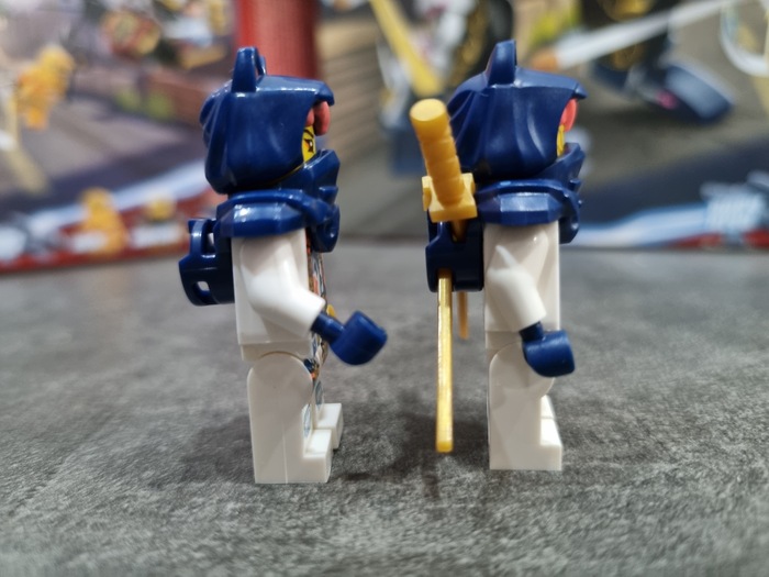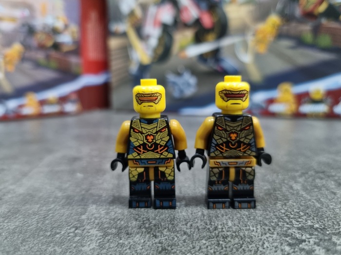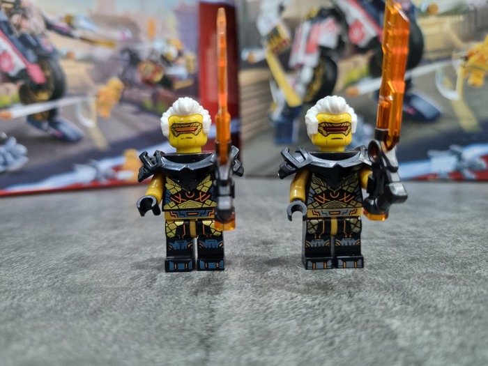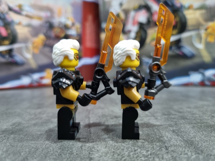 Наиболее неудачная минифигурка из всех представленных: неоригинал выделяется потертыми принтами лиц, неправильным цветом принтов на теле и ногах, более глянцевой броней и более мутной прозрачной деталью оружия( проблема всех прозрачных неоригинальных деталей). Так же именно у этой минифигурки крайне хлипкая конструкция: голова толком не держится, да и ноги постоянно хотят отсоединиться.