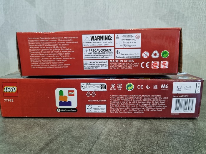 На неоригинальной коробке присутствует логотип лего(что удивительно),но только на лицевой и задней стороне коробке, у них не совпадают номера наборов и количество деталей в комплекте. Так же на оригинальной коробке присутствуйт все qr , штрих-коды и ссылки на сайт лего.