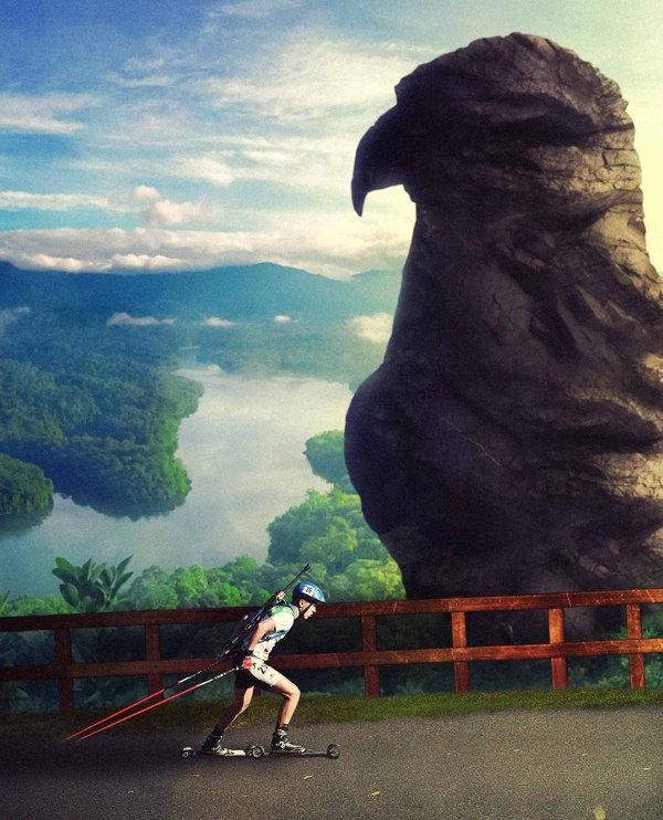 2)С помощью Clone stamp tool корректируем небо, облака, холмы.