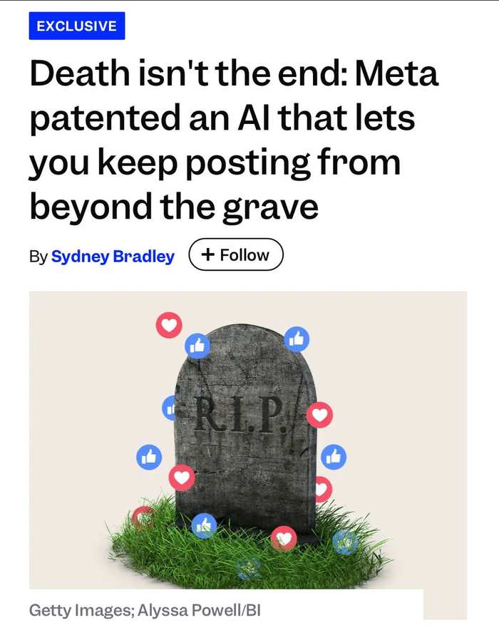 Meta* получила патент на технологию, которая позволит ИИ вести ваш аккаунт в соцсетях после вашей смерти. Нейросеть будет обучаться на ваших постах, лайках и комментариях, чтобы имитировать ваш стиль общения, отвечать друзьям и поддерживать эффект присутствия.