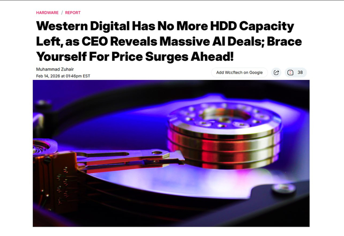 Крупнейший производитель HDD заявил, что все мощности компании на 2026 год уже распроданы крупным клиентам. Всё из-за взрывного спроса на постройку дата-центров.