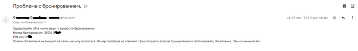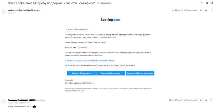 И всё это могло бы быть вполне рядовой ситуацией, если бы не реакция букинга на нее. А точнее, ее полное отсутствие. Еще днем я написал 2 письма в поддержку с просьбой помочь разобраться в ситуации, а также позвонил по платному номеру, где меня просто разъединили спустя 4 минуты, пока я висел в очереди. Самое первое письмо было отправлено через форму обратной связи, поэтому не сохранилось.