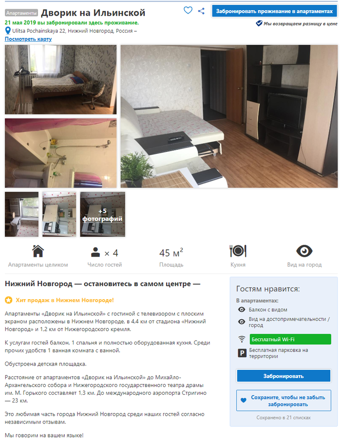 Несколько дней назад мы с подругой скатались в Нижний Новгород отдохнуть на выходные. И для ночлега я отыскал на упомянутом сайте сей прекрасный вариант и внес предоплату с карты. Есть даже ссылка http://www.booking.com/Share-WS8LNc