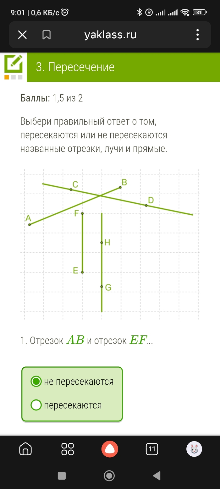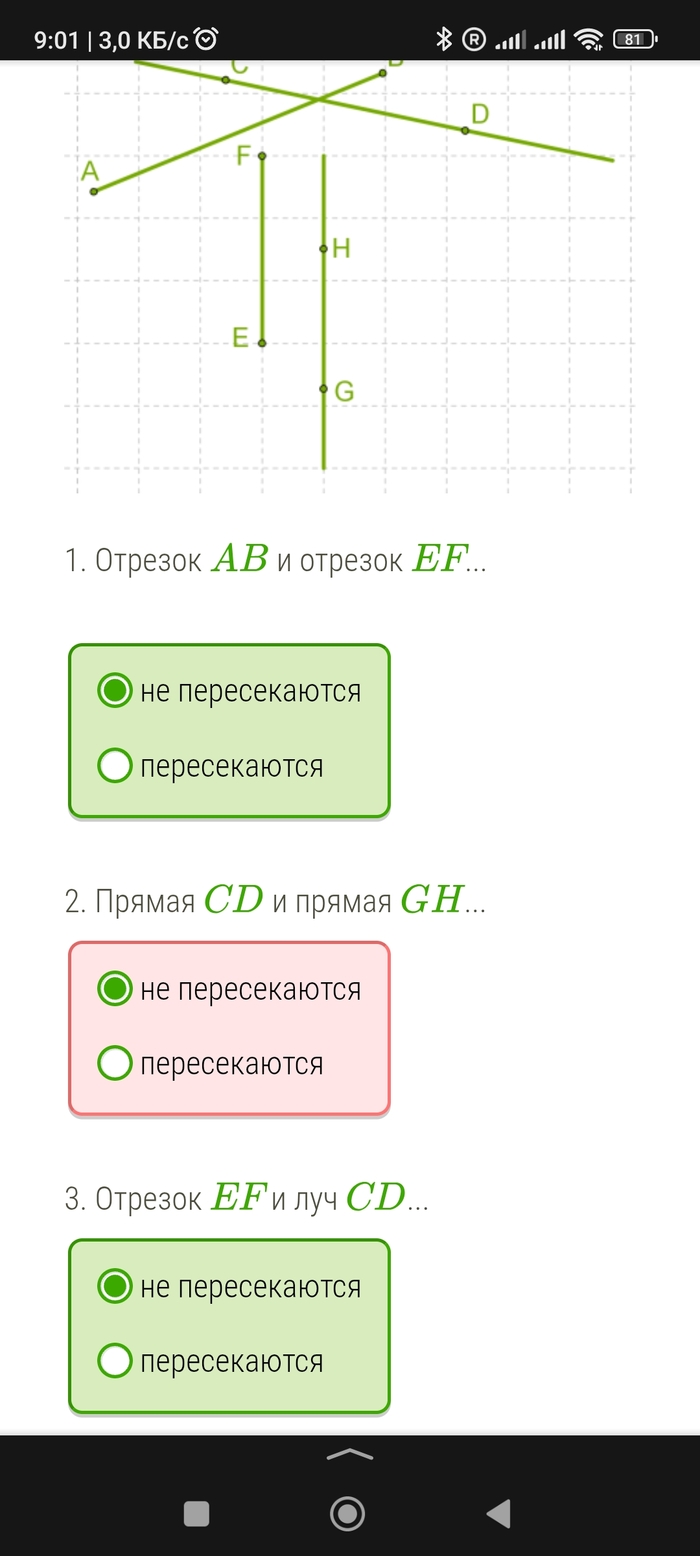 Итак, ключевое, что нас интересует, это факт события, т.е. пересекаются или не пересекаются прямые в данный конкретный момент на рисунке. Мне, физмату из 90-2000ых, вполне очевидно, что в данный момент прямые на плоскости не пересекаются, потому как результатом пересечения двух прямых есть точка пересечения, которая становится вершиной углов, образованных пересечением этих самых прямых в этой самой точке, блин! Да, мы знаем и помним, что все прямые бесконечны и на плоскости они могут пересечься при мысленном их продлении и при условии, что они не параллельны. Но в данный момент, на рисунке и по условию, прямые CD и GH не пересекаются. Если вы хотите проверить знание ученика о том, что они могут пересечься в будущем, то формулируйте задание корректо, по типу: "могут ли пересечься прямые и далее по тексту". Поскольку дети только знакомятся с азами геометрии, крайне важно, чтобы вот эти все абстрактные сущности имели четкое соотнесение с реальностью. Когда мы показываем рисунок плоскости (допустим карту), на котором в данный момент двигаются два автомобиля (один в Москве, второй во Владивостоке) и говорим ему, что они пересеклись и между ними случилось ДТП (при расстоянии между ними в несколько тысяч км), у ребёнка тут же случается ступор, по типу "какого хера?", а потом возникает аппатия и полная утрата интереса к происходящему, и дальнейшему изучению этой ебанины. Учителю я об этом всё написал, в надежде, что это ошибка на сайте и нужно это исправить, но чуда не случилось.