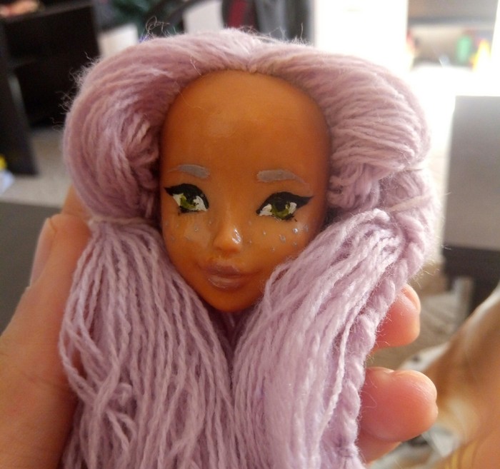 И вот я выбрав пряжу (на трессы денег нет, а пряжи разной до фига)прошиваю голову. Перед прошивкой зону волос окрасила в цвет шевелюры.
