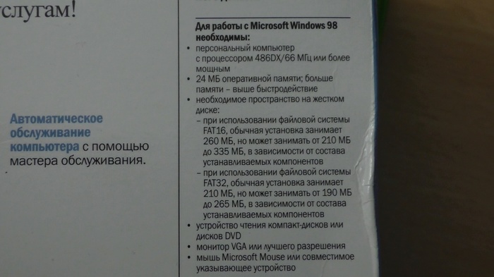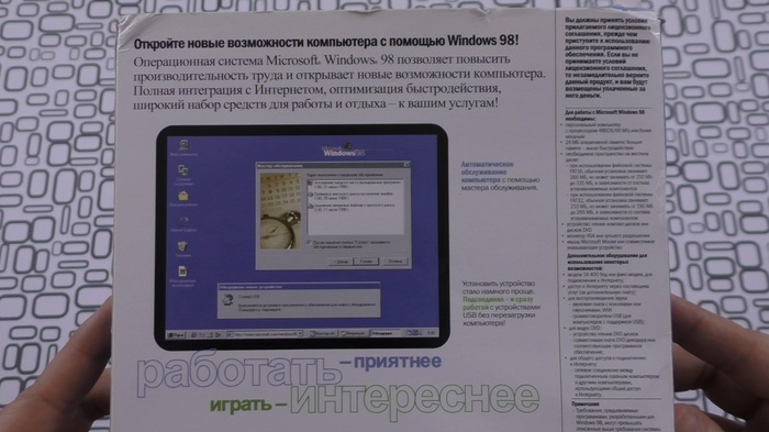 Естественно, коробка покрыта воодушевляющими надписями, например обещание, что Windows 98 «улучшает работу компьютера». Любопытно, относительно чего он улучшает? Относительно Доса? Windows 95? OS/2? Windows NT? В общем, рекламщики такие рекламщики.