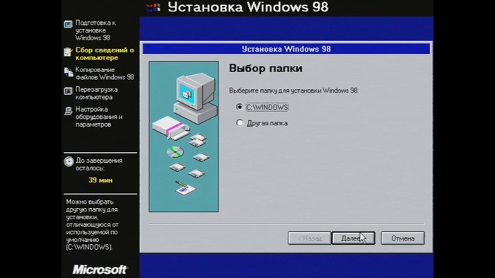 В-третьих: можно выбрать папку установки! Например, вам хочется, что-бы Windows была установлена в папку C:\WIN98 или даже просто C:\W? Да пожалуйста!