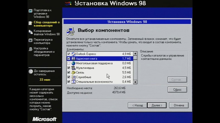 В-четвёртых: в Windows 95/98 можно выбирать набор компонентов при установке.