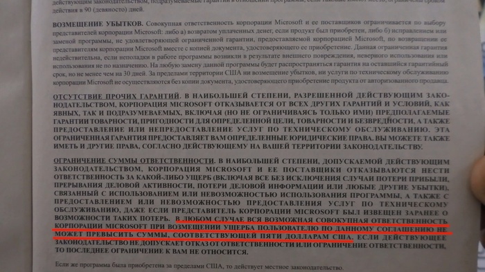 Далее идёт текст лицензионного соглашения об ограниченной гарантии, часть того самого текст, который никто и никогда не читает. А ведь там наверняка есть нечто интересное, если перевести с юридического на человеческий. Вот вам например любопытный факт: в случае каких-либо проблем компания microsoft готова возместить пользователю сумму в максимум 5 долларов США. Такие дела.