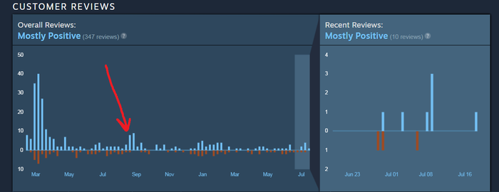 Я решил добавить мультиплеер, возможность создавать собственные матчи, а также большой графический апдейт. Я нашёл классного художника, который заменил мои кривые модельки - красивыми. В общем, после апдейта все возрадовались. Это хорошо видно на графике отзывов. Хотя при этом я поднял базовую цену с $10 до $15.