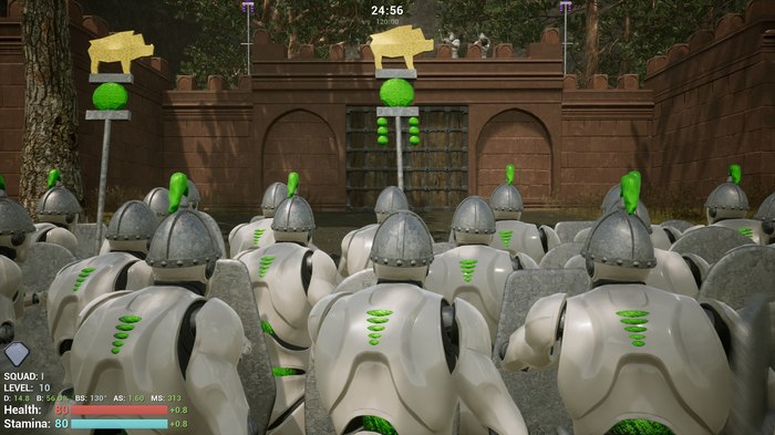 И второй недостаток M&B - их жанр. То есть, жанр, конечно хороший. Но мне не нравится режим игры через "битвы" на карте кампании. Я так не чувствую погружения. Я не чувствую предыстории сражения, я не чувствую последствий сражения. И мне хотелось дать именно это. Этот вопрос как раз решает RTS составляющая. Ты осаждаешь замок противника, несёшь потери, отступаешь на базу, а потом теми же воинами защищаешь свою базу. И это не просто цифры а ля "столько-то убежало, столько-то ранено, столько-то дезертировало". Я вижу конкретного робота, который получает свой собственный уровень, который может получить урон и убежать на базу лечиться, а потом сразу же встать на защиту своего замка, или поймать шальную стрелу по пути домой. Я это всё могу "пощупать" глазами.