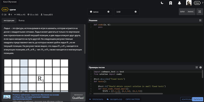 После удачного выполнения, можно посмотреть код, которым решили данную задачу другие участники. Ответы других участников, можно посмотреть и до правильного решения, если зашли в тупик, но в таком случае ваш рейтинг не поднимается