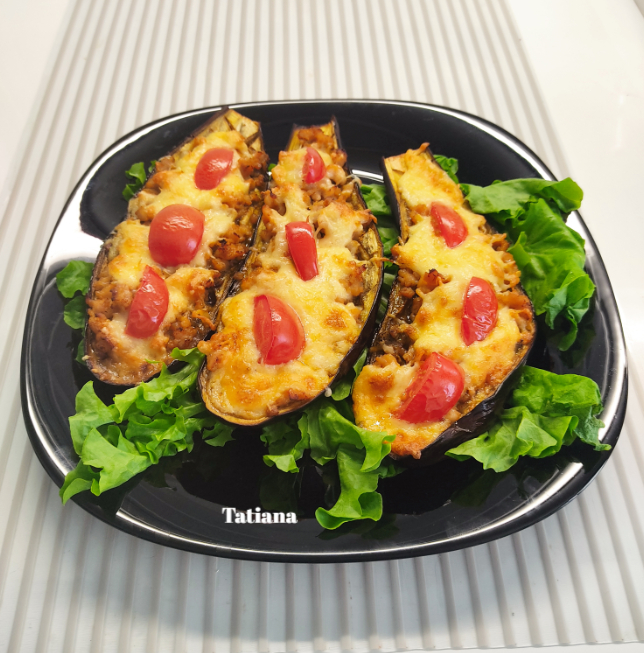Когда баклажан запечется, размять мякоть ложкой, выложить мясной соус и сверху смесь из сыра в терку+чеснок (или кусочки сыра фета).