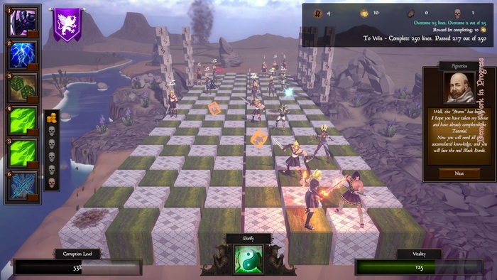 Однообразность преодолена. Ранее я считал, что игре для интересности достаточно базовых правил шахматные механики, особенности "бессмертных" героев и различные бонусы умения (больше 20). Сейчас в игре реализованы 9 игровых ситуаций, которые накладываются на основные правила и могут встречаться в любых сочетаниях. Ситуации очень разные и каждая по своему интересна. Каждый бой уникален, каждая сюжетная кампания уникальна.