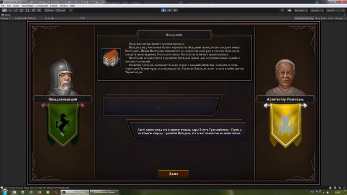 Как удалось связать это все воедино. И вот тут пожалуй не самое сложное, но самое главное нововведение в игру - Сюжетная кампания. Сюжет у меня был и раньше в виде Пролога в Храме Гроссмейстера, в виде подсказок архивариуса Агноция, в виде описаний Построек Цитадели и Провинций на карте кампании и в виде текстов в обучающей кампании. Но сейчас я добавил Аудиенции с советниками. Помните как в Цивилизации и ей подобных играх разные министры в контексте происходящего рекомендовали то или иное действие в определенный момент.