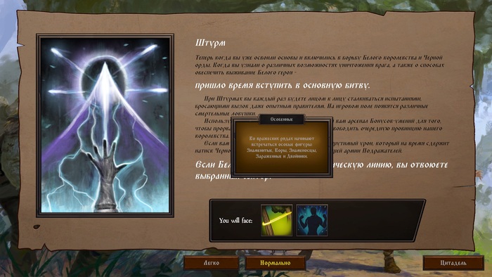 По совету друзей и неравнодушных игроков я сделал интерфейс появляющимся по мере обучения. Это можно увидеть в обучающей кампании. Некоторые элементы интерфейса появляются только в сюжетной кампании когда поваляются новые механики. Цитадель не ошарашивает возможностью прокачки разных зданий с самого начала. Изначально она стоит в руинах. Лишь нелинейное появление определенного сюжетного диалога может дать возможность построить на месте руин то или иное здание. Но его можно и не строить если не хотите. Новые игровые режимы или места интереса появляются в кампании только после сюжетных диалогов. Режимы Головоломки появляются сильно позже чем раньше.