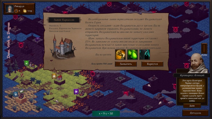Скромная и унылая Карта кампании. Тут все тоже было не так просто. Явно прослеживающаяся около шахматная тематика моей игры наталкивала на такую карту. Черные захватили всю территорию, а белые ее отвоевывают. По мере прогресса игрока карта становится белой и чистой от скверны как была до войны. Но претензии на бледную карту сыпались очень частые и я решил пойти другим путем. Цветущее и красивое Белогорье было захвачено черными Ордами.