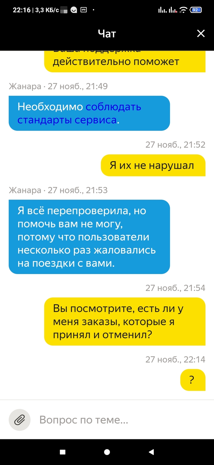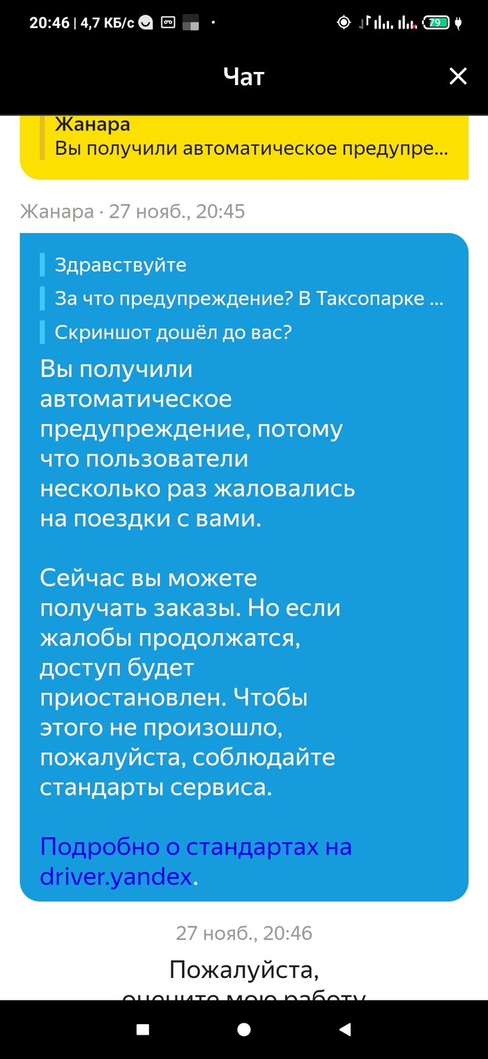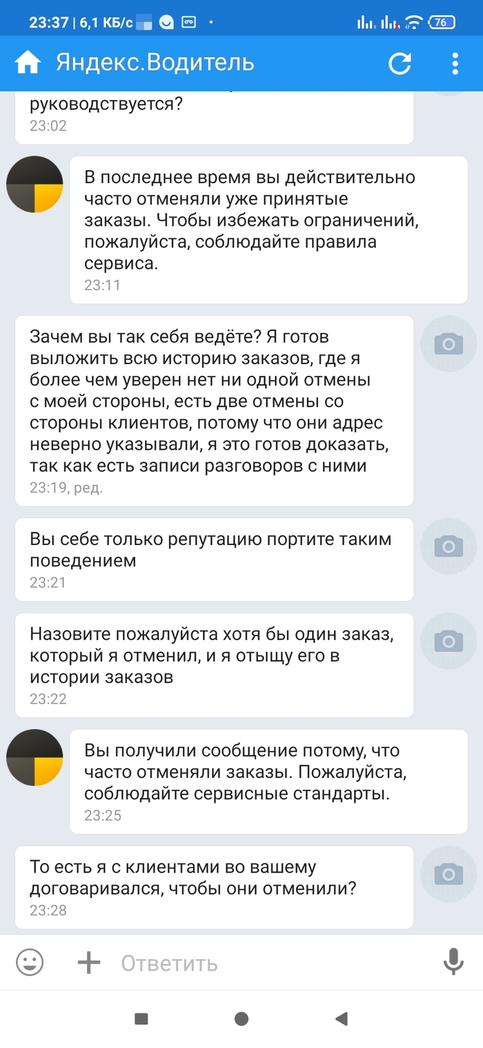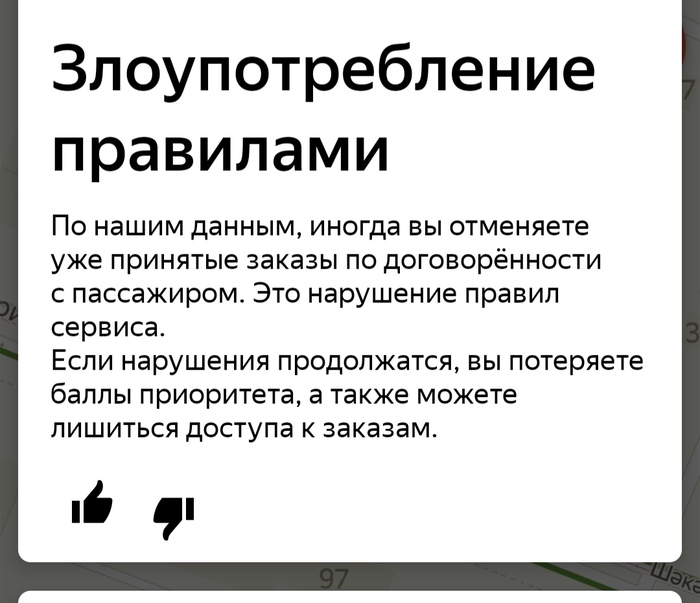 Что я якобы отменяю принятые заказы и беру оплату сразу себе в карман. Это наверное было бы очень глупо с моей стороны, потому что комиссия в нашем небольшом городке 1%. Позвонил в свой Таксопарк, узнать в чем причина, учитывая что за все время, что я таксовал, я отменял заказ всего один раз, причём полгода назад, когда после 10 минут клиент так и не вышел. В саппорте ничего внятного мне не объяснили. Потом до меня дошло, вчера был заказ, доставка от двери до двери с смс подтверждением, я его принял, приехал в пункт выдачи, а там на меня косо посмотрели и сказали что я уже четвёртый по счету курьер за весь день, который приехал за этим товаром, и товар уже давно отвезли клиенту. Заказ отменять отказались, якобы их вины нет, это Яндекс заглючил, дабы не терять активность, я тоже не стал его отменять и позвонил в поддержку, где мне сказали что никакой компенсации не будет, но я могу отменить заказ через 10 минут и если со стороны магазина будет ещё раз что-то подобное, то их заблокируют. Разговаривал по громкой связи, менеджер услышал про возможную блокировку сразу отменил заказ и мне на счёт упала гарантированная оплата. Однако сегодня утром пришло это самое предупреждение. Решил написать напрямую в тех поддержку Яндекса
