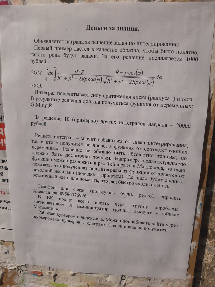 875 Nickname62 Новый вид объявлений1 5 лет назад Сегодня после прогулки с собакой увидел у подъезда вот такое объявление. Интересно, кто то вспомнил про задание на лето или реально готовы платить за какие то примеры) Показать полностью 1 [моё] Объявление Интеграл Заработок Ещё 0