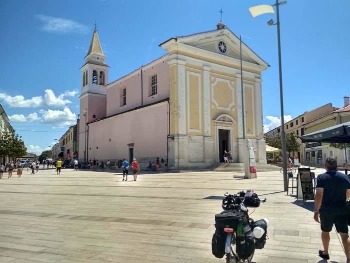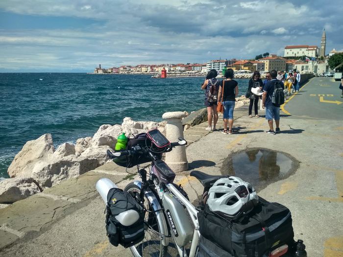 Следующей остановкой был Пиран. В этом городе я был почти десять лет назад - и вот теперь снова вернулся, теперь уже на велосипеде. Город оказался чересчур многолюдным. Кроме машин я постоянно натыкался на туристов, прохаживающихся вдоль набережной. Так что я быстро сделал фотку у памятной мне часовни и развернулся к границе с Хорватией.