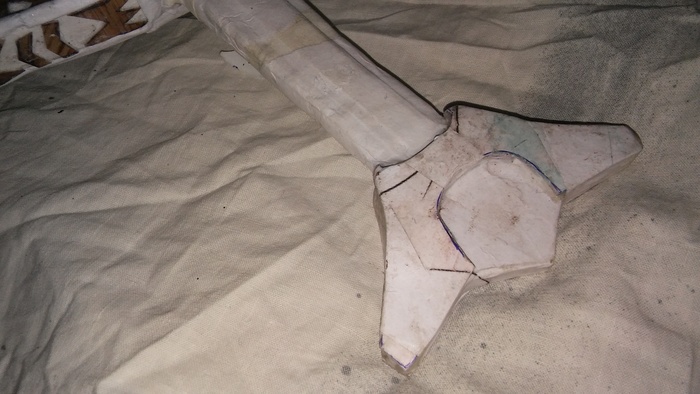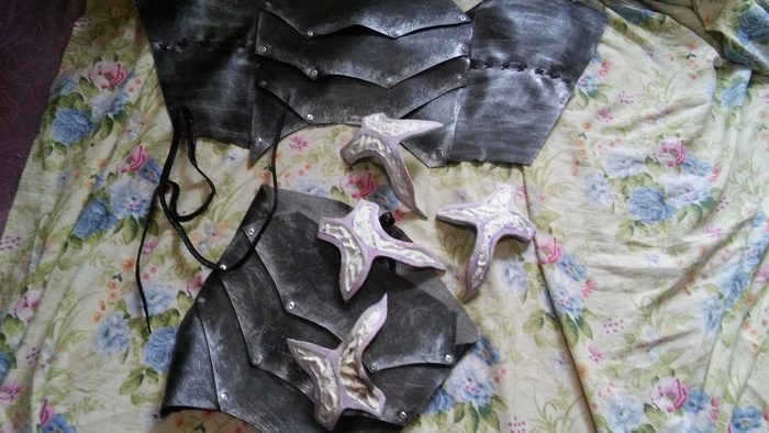 Это кажется набедренники. Я резал по пепакуре, клеил моментом и сшивал нитками. Хотел рисовать паяльником но не вышло, опять папье-маше, всё покрыл несколькими слоями бумаги потом накладки из картона и бумаги, полосы из массы, покрасил как и раньше. Пластмассовый коврик и папье маше сверху, так я сделал большую часть брони