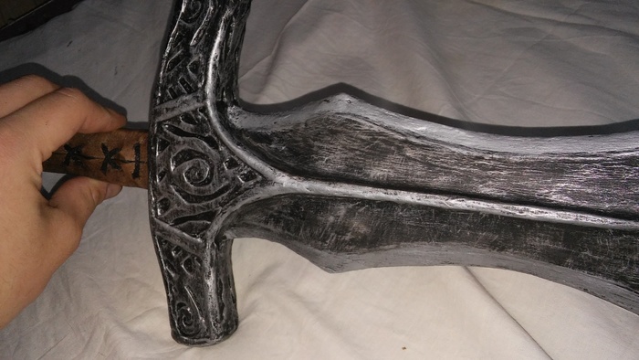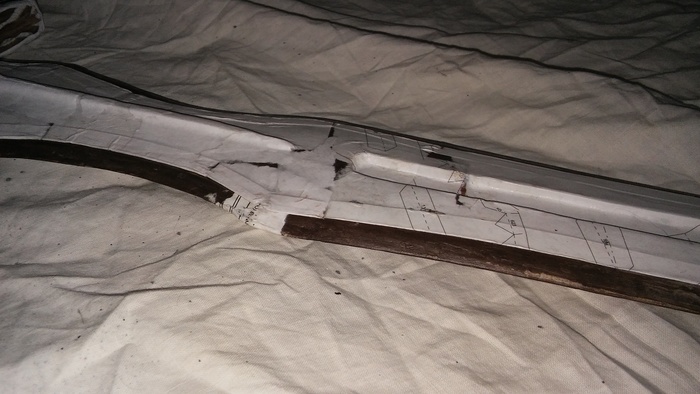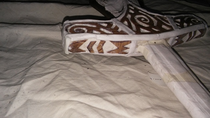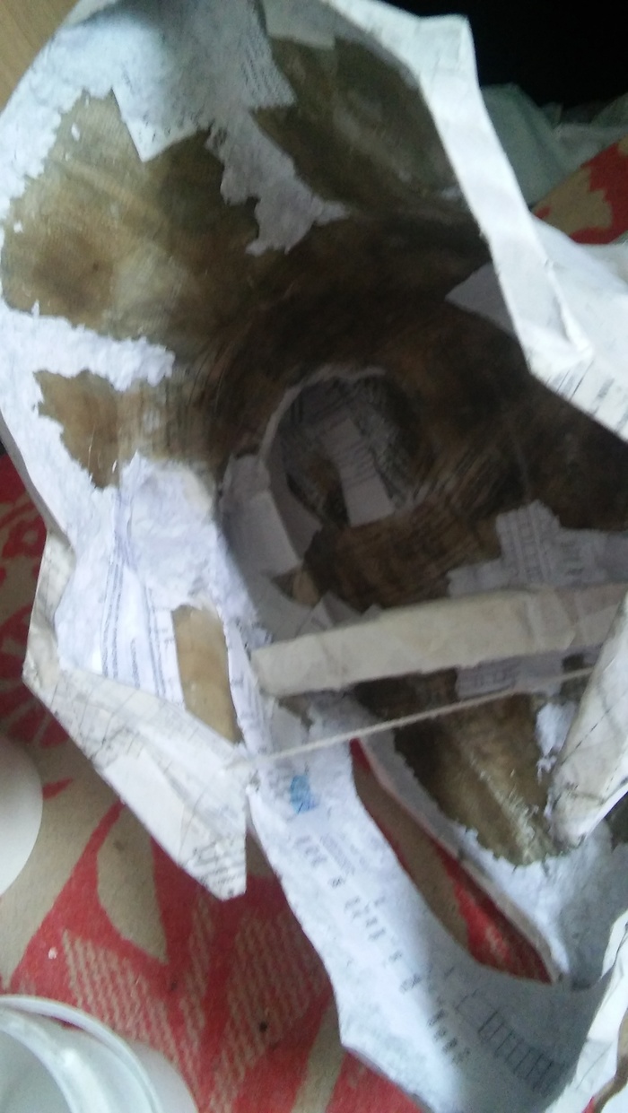 Пепакура, далее укрепление стеклопластиком, папье-маше, накладки это куски картона и шпаклёвка, рельеф из массы папье-маше, заклёпки тоже лепил, потом я их срезал и приклеил ровней, ещё после добавил нитролака и подкрасил, вклеил сетку в дырки и внутрь губки, для удобства.
