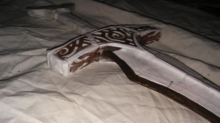 Я распечатал и склеил модель из пепакуры, всё укрепил и рельеф выложил полностью из папье-маше, низ из линолеума, немного ниток, саморезов, заклёпок и шайб. Покрашено чёрным акрилом и масляным металликом, позже ещё покрыл нитролаком и опять металликом (Всё так красил).