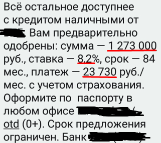 При заявленной в СМСке процентной ставке и сумме ежемесячного платежа сумма кредита порядочно увеличивается, а именно на 242 тысячи (Судя по всему это и есть страховка). Таких страховок в принципе не может быть, это можно проверить на сайтах страхования.