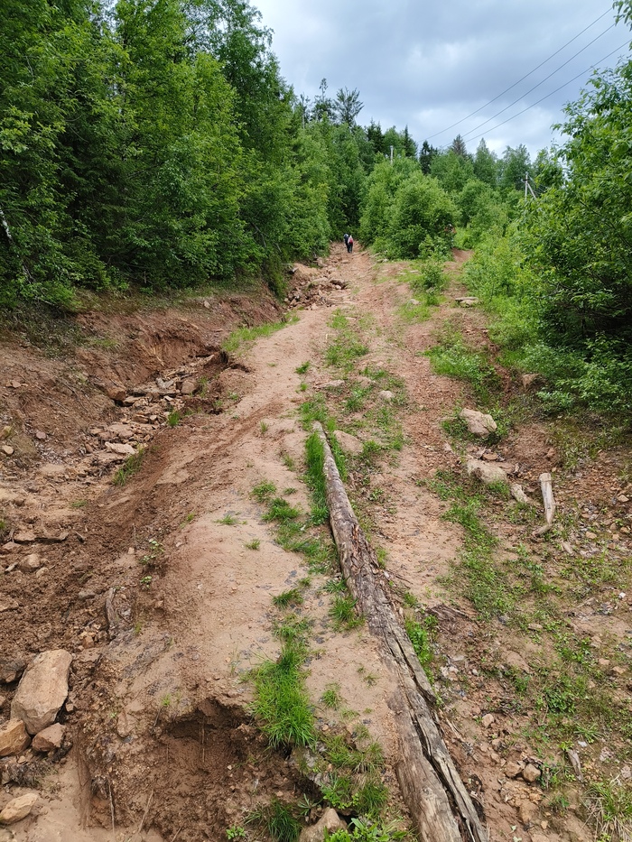 Подходя к вершине, все чаще попадаются камни. Тем не менее, движение транспортных средств по ней вполне себе оживленное. По пути на гору нас обогнала команда мотоциклистов, по приходу на вершину мы обнаружили там группу ребят на двух подготовленных нивах, на обратном пути нам встретилась группа на квадриках. Также много людей шло пешком, и их поджидали болотоходы и буханки для возвращения к реке.