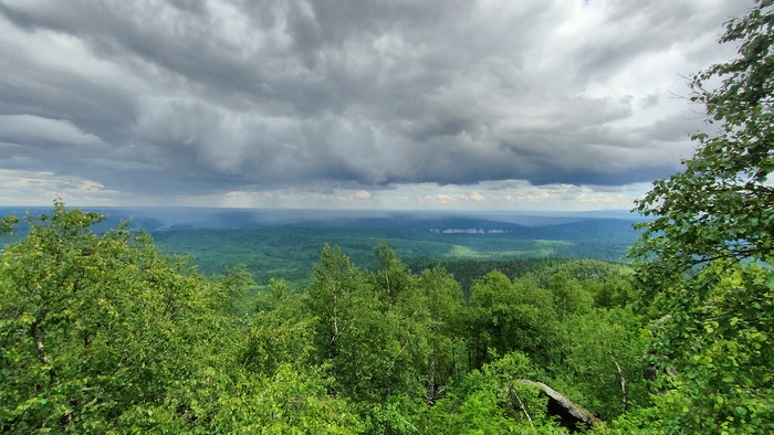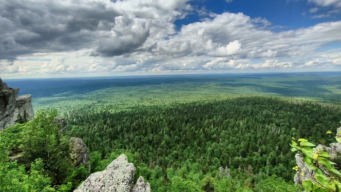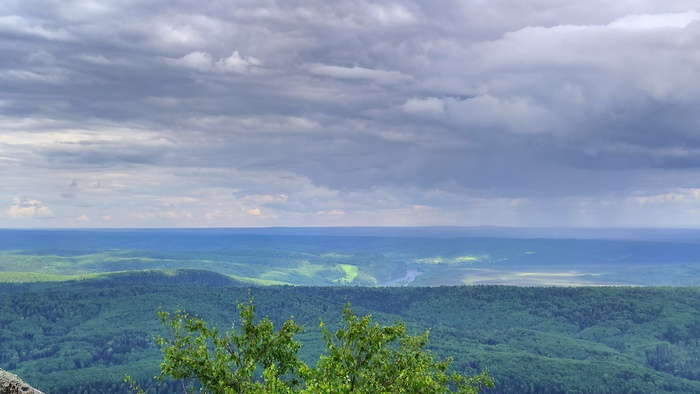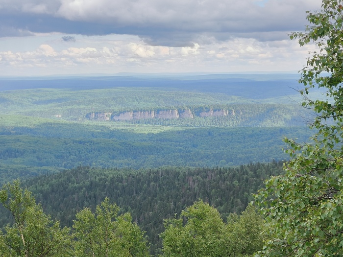 Виды с вершины открываются потрясающие. На горизонте видно Чердынь, как на ладони далеко внизу Ветлан и участок Вишеры под ним, удалось даже разглядеть тот остров, за которым я поймал финальную в этом путешествии щучку. Кругом сплошные дремучие леса.