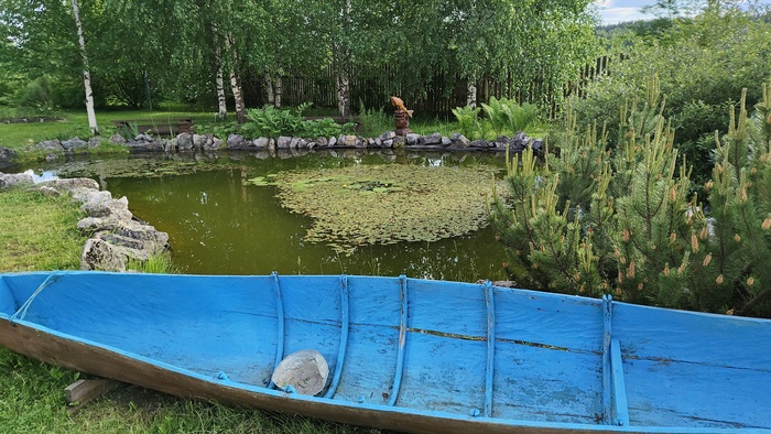 Камни по пути встречались все чаще, плесы перемежались с перекатами. На одном из перекатов я поймал на маленькую колебалку небольшого хариуса, который, как и прошлый, не пожелал даться в руки и отцепился над катамараном, самостоятельно отправившись в родную стихию. Вскоре после этого на том же перекате во время очередной технической остановки нам встретились пара перевернутых лодок, а далее по тропинке целый рыбацкий бревенчатый домик с терраской. Он был довольно обжитым, явно регулярно использовался по назначению, рядом с ним стояла небольшая банька из бруса, но хозяев дома не оказалось.