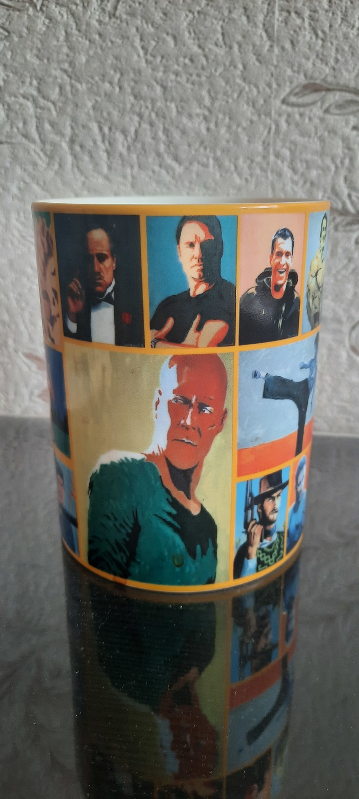 Подарила кружку, точнее купила то, что было выбрано именинником. Коллаж из рисунков крутых актёров питерского художника. Угадали всех, даже самого художника, а последнего никак не разгадать. Это точно не Рассел Кроу и не Джеральд Батлер, они на кружке есть.