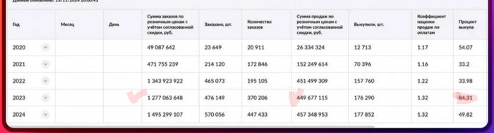 Это их "миллиардный" кабинет на вб - основа их рекламной компании и залог безбедной жизни. Стал изучать цифры. Очень впечатлился. Потом стал изучать ещё и понял, что меня смущает. (это самое я отметил красным на скриншоте). Кто не понял - объясняю. В этом кабинете заказов в 2023 году было ~ 1,2 млрд, выкупов на чуть меньше, чем 500 миллионов. А процент выкупа, который автоматически считается вб стоит 84%, что совершенно не соответствует цифрам заказов и продаж. Поэтому я, как фотошоп ответственно заявляю, что это программист. Ну или наоборот, в общем, вы поняли. Решил написать ребятам: