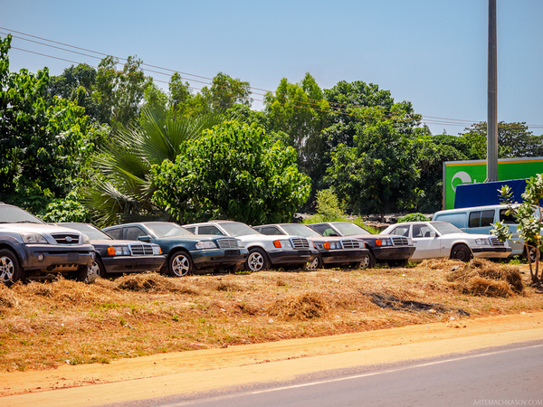 Вот так вот печально выглядит автобизнес в Гамбии. Если вы считаете, что это касается только старых машин, то вот вам фотографии дилерства Mercedes-Benz. У входа стоят почему-то совсем не те автомобили, а покрытые толстым слоем пыли китайские кроссоверы.