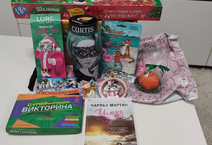 В которой были: крема, масочка, свечка-мандаринка, магнитики, игра-настолочка, и книга- уверена, что очень интересная.
