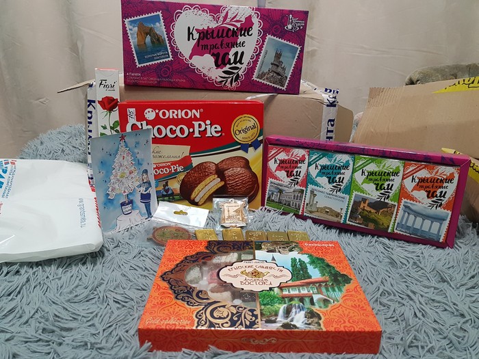 Супер милый пакетик от почты России (люблю такие ми-ми-ми), в котором меня ждал очень интересный чай со вкусом шампанского и внутри него интригующая маска:) и игра фанты с предсказанием, которые использую по назначению в нг-ночь. А ещё загадочная коробка.