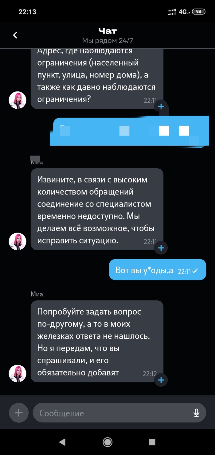 Ладно: раньше вышки не было, вы только заехали в регион. Но сейчас то почему!? 107dbm! Метеоусловия!? Так у меня всегда тут так вне зависимости от метео. Хоть метеорит прилети! И не только у меня. Вы,супербрендовые, нежели в рекламе пи**ите про скоростной инет и надежную связь - обеспечьте ее! Заманало. Билайн,МТС и Мегафон работают. Одни вы,рабы Ростелекома,хромаете! Да даже Ростелекомом я доволен! Ни разу не подвели и отвечают всегда. Да,как бабка скажет,но всегда! А с инетом их проблем не было,в отличии от качества ваших услуг.
