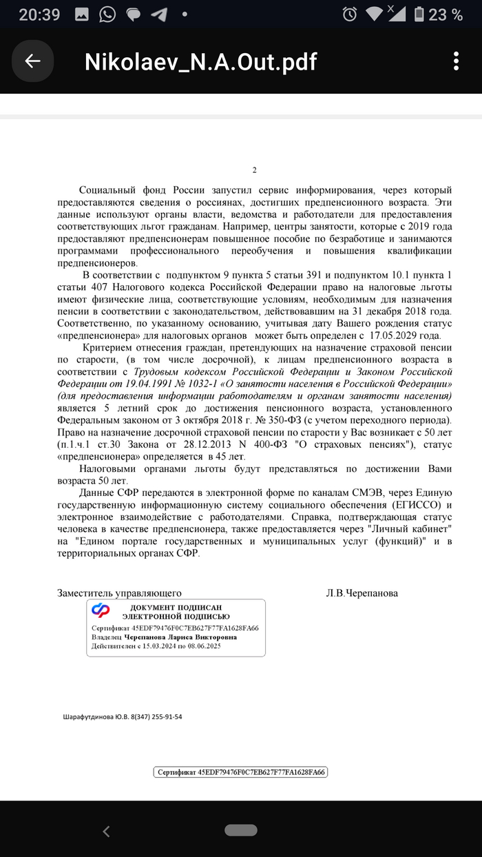 Итак, выхожу на пенсию в 50. По группе А, кто в курсах. Щас мне 45, и я типа получил статус "предпенсионнера". Этот статус даёт некоторые плюшки, но как я выяснил, я предпенсионнер перед предприятием и соц услугами, но не перед налоговой. А там основные послабления. Накатал предсудебное в соц фонд, как так не может быть статуса на половину!? Прислали письмо, что может и перед налоговой я только в 50. Как так!? Объясните по русски пожалуйста! Вот письмо.
