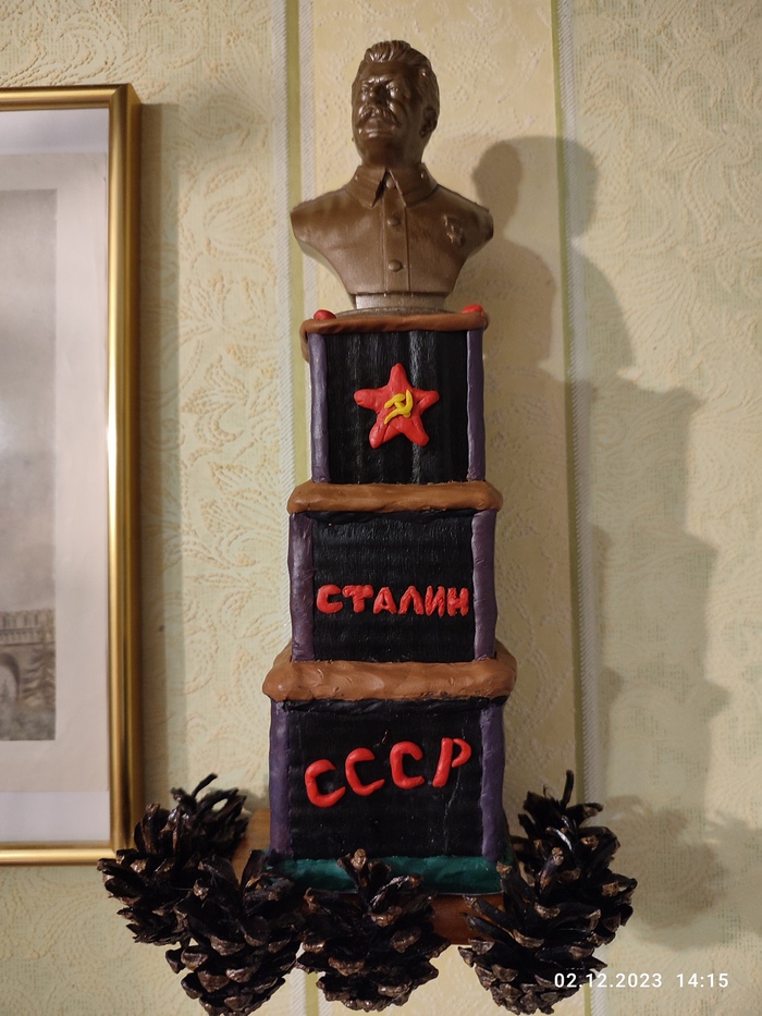 Вот доделал постамент и полочку, что бы все было красиво. Был только бюст. Использовал картон для каркаса, краску и пластилин. Полочка из дощечки, которую покрыл раком и шишок, тоже лакированных.