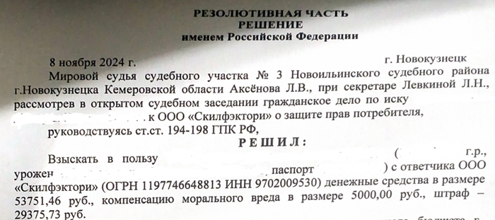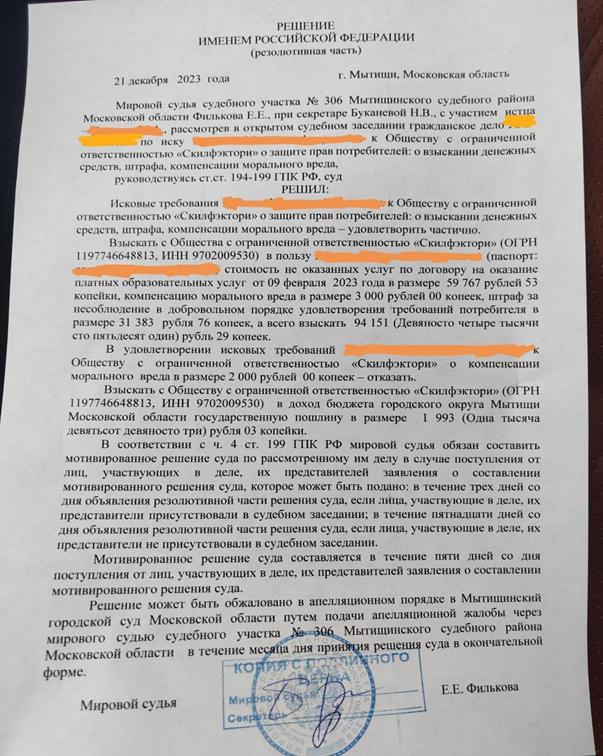 Итого, суд постановил взыскать в пользу студента невозвращенную часть денежных средств, штраф и компенсацию морального вреда.