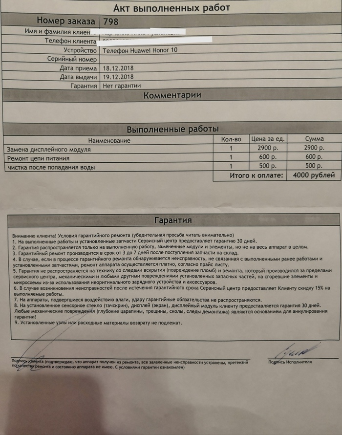 17.12 вечером уронила телефон в воду Honor 10. Сразу достала его из воды выключила, но по глупости включила его через 2 часа. Он сначала работал, но потом картинка пропала горела только подсветка. 18.12 принесла его в СЦ. Вроде по отзывам хороший. Т. к. я пришла туда за 1.5 часа до закрытия, мне предложили его оставить до следующего дня. Я согласилась. Меня сразу предупредили что если придётся менять экран, будет только неоригинальный (т. е. без отпечатка пальца) стоил он 2900 р., я дала добро. На следующий день мне позвонили и сказали что все таки нужна будет замена и все вместе выйдет в районе 4000 тыс. Вечером я пришла за телефоном. Работник сервиса отдал мне квитанцию чтобы я расписалась и телефон. На мой вопрос можно ли забрать свой старый дисплей, мне ответили что он был весь в трещинах и им пришлось его выбросить. О том что мне подобрали оригинальный экран я узнала только в СЦ причём сумма почему-то была такая же 2900 , и то только после того как я спросила о Touch ID. Я оплатила сумму 4000 рублей из них 2900 р. за дисплей, ну и соответственно забрала телефон. Еще я спросила, можно ли мне будет обратиться с этим случаем в страховую, т.к. у меня была страховка на дисплей, он ответил то что не пройдет, утопленников сразу разворачивают.
