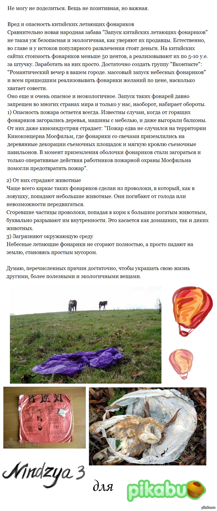 129 Nindzya3 Запуски китайских фонариков 12 лет назад Это движение очень популярно, но все не так хорошо как хотелось бы. Многие организаторы за эту инфу меня банят, поэтому я выкладываю это на суд пикабушников) Природа Экология
